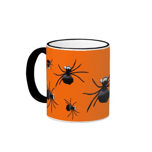 Use this silly bug-eyed spider mug when you go trick or treating on Halloween or any time of year. They won't scare anyone but you are sure to get lots of laughs and goodies. Black spiders with white eyes bugging out of their heads are scattered on an orange background.