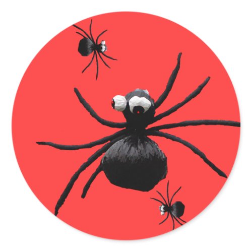 Use this silly bug-eyed spider sticker when you go trick or treating on Halloween or any time of year. He won't scare anyone but you are sure to get lots of laughs and goodies. He is a large black spider with white eyes bugging out of his head. More spiders are scattered on the orange red background.