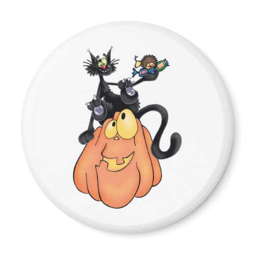 whimsical cat on top of pumpkin fun fridge magnet. Great gift for your Halloween party guests. Save money when you buy 10 or more magnets.