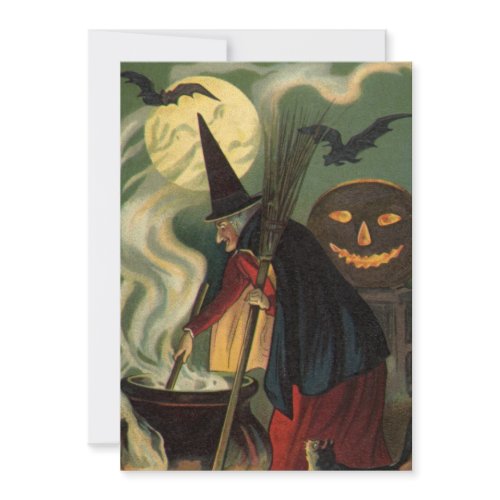 Vintage illustration Halloween design featuring a wicked witch stirring her witch's brew in a black cauldron. A full moon, bats and a jack-o-lantern make this Halloween picture complete!