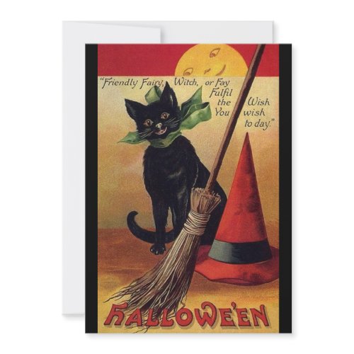 Vintage illustration Halloween design featuring a cute black cat sitting next to a witch's broom and hat.