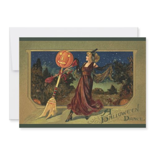 Vintage illustration Halloween design featuring a beautiful witch dancing with a broom with a jack-o-lantern head.